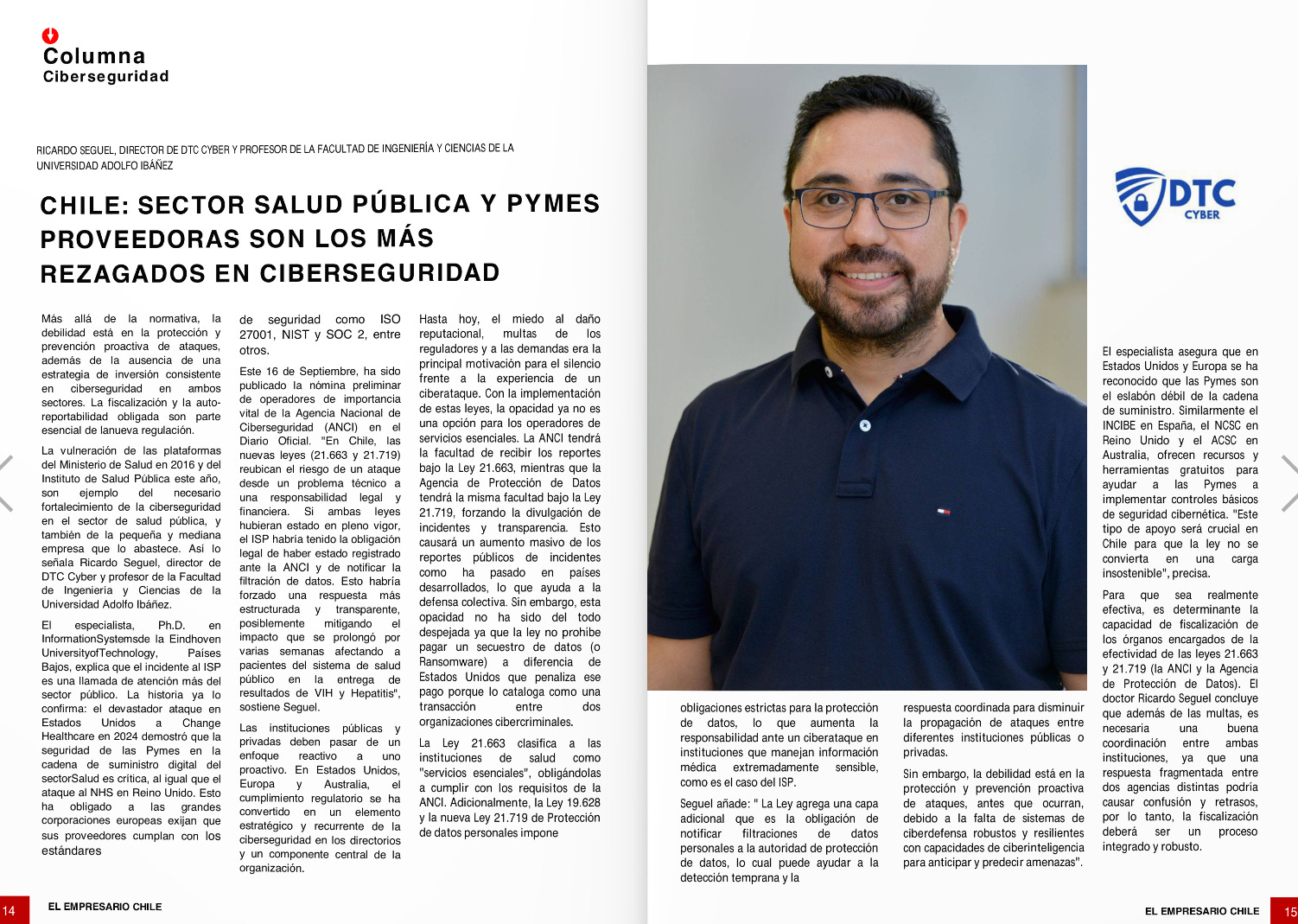 Revista El Empresario Chile, en su Columna de Ciberseguridad, destaca los comentarios de Ricardo Seguel, PhD., Director de DTC Cyber.