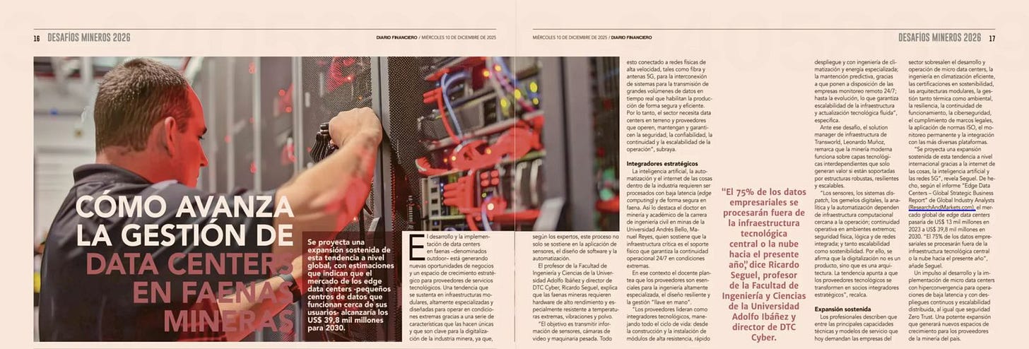 Diario Financiero, destaca los comentarios de Ricardo Seguel, PhD., Director DTC Cyber, donde comenta sobre los progresos y retos en materia de Gestión de Data Center en minería.