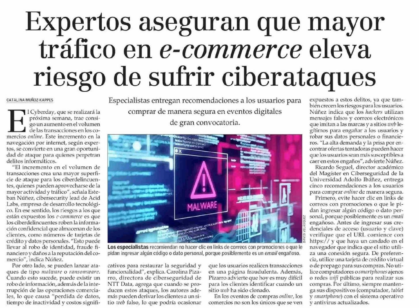 El Mercurio, Catalina Muñoz-Kappes, destaca los comentarios de Ricardo Seguel, Ph.D. director académico del Magíster de Ciberseguridad de la Facultad de Ingeniería y Ciencias UAI, donde afirmó que la alta demanda e interés por ofertas "pueden hacer que los usuarios sean más susceptibles a caer en estos engaños".