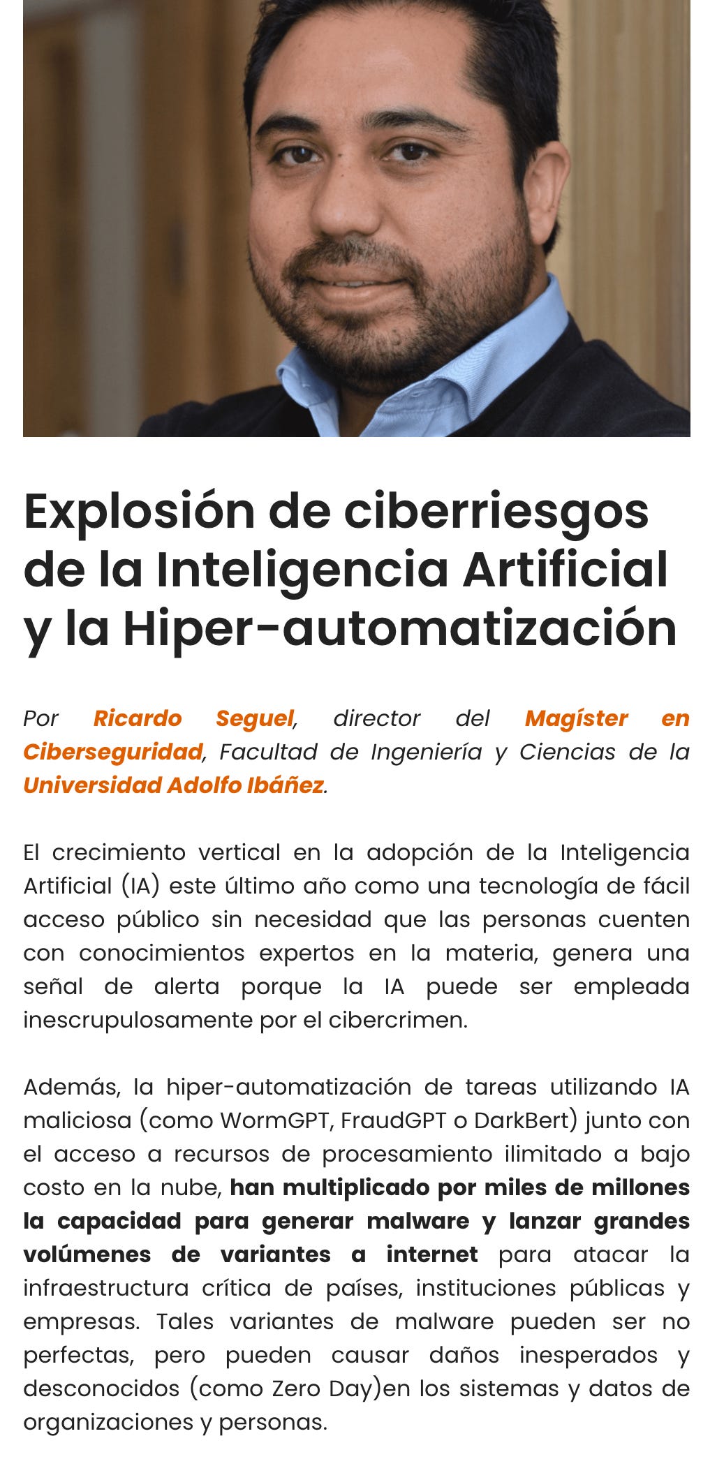 “La Inteligencia Artificial es una doble amenaza: más accesible y más peligrosa", advierte Ricardo Seguel.