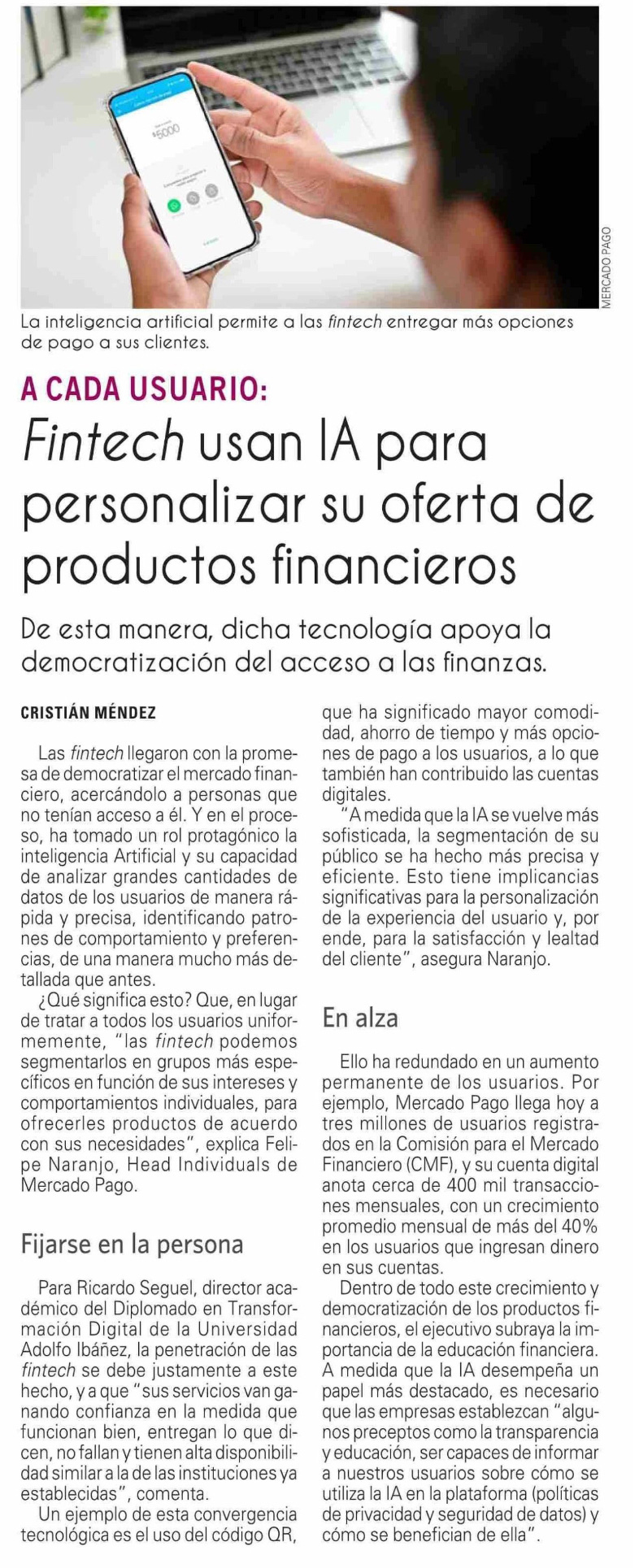 El Mercurio, Cristián Méndez de la Fuente destaca hoy los comentarios de Ricardo Seguel, director académico del Diplomado en Transformación Digital de la Facultad de Ingeniería y Ciencias UAI, acerca de l impacto de inteligencia artificial en las Fintech.