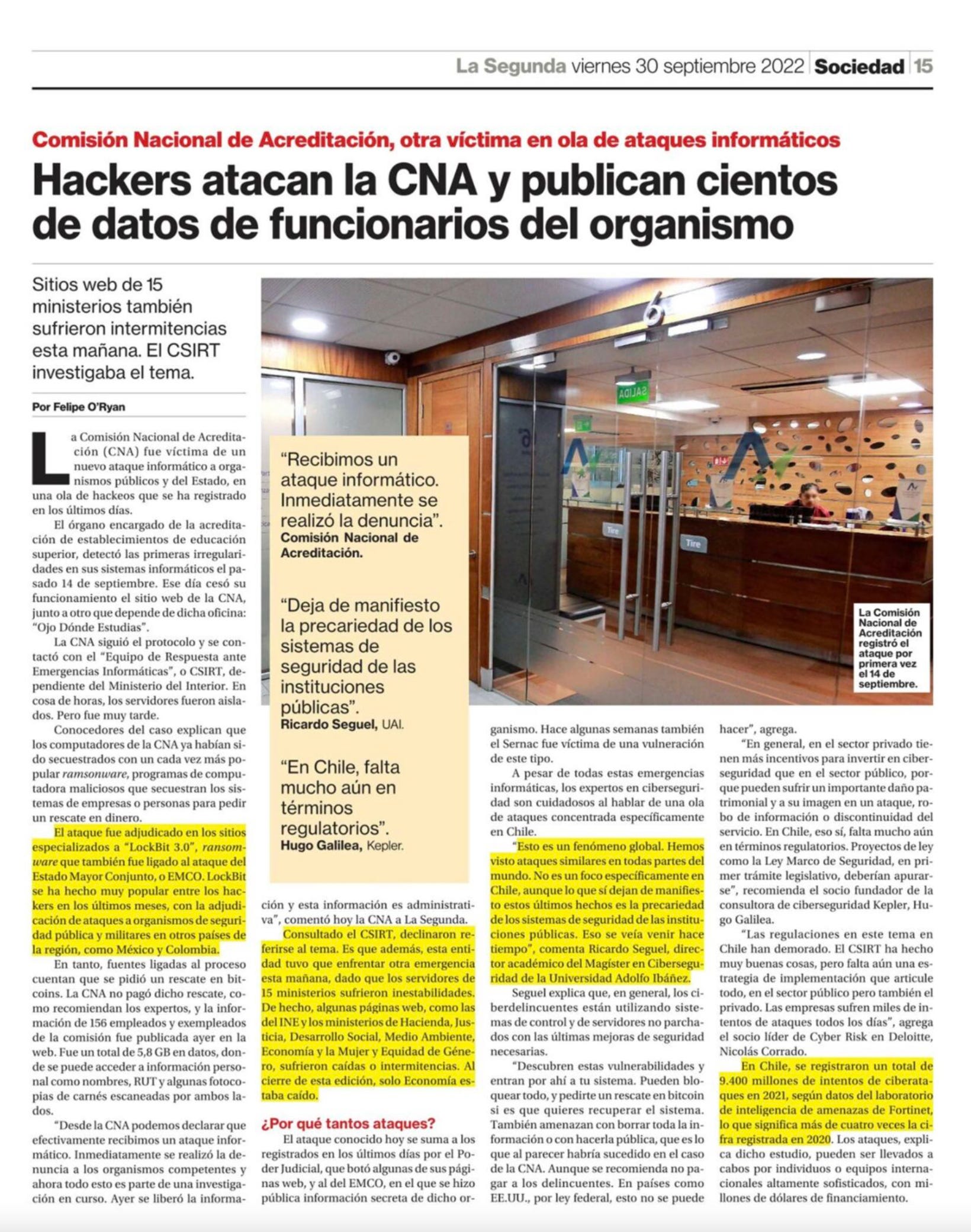 Diario La Segunda destacó los comentarios de Ricardo Seguel, PhD., director académico del Magíster de Ciberseguridad Facultad de Ingeniería y Ciencias UAI acerca de la ola de ciberataques que investiga el CSIRT GOB. Este es un fenómenos global. Hemos visto ataques similares en todas partes del mundo. No es un foco específicamente en Chile, aunque lo que sí dejan de manifiesto estos últimos hechos es la precariedad de los sistemas de seguridad de las instituciones públicas".
