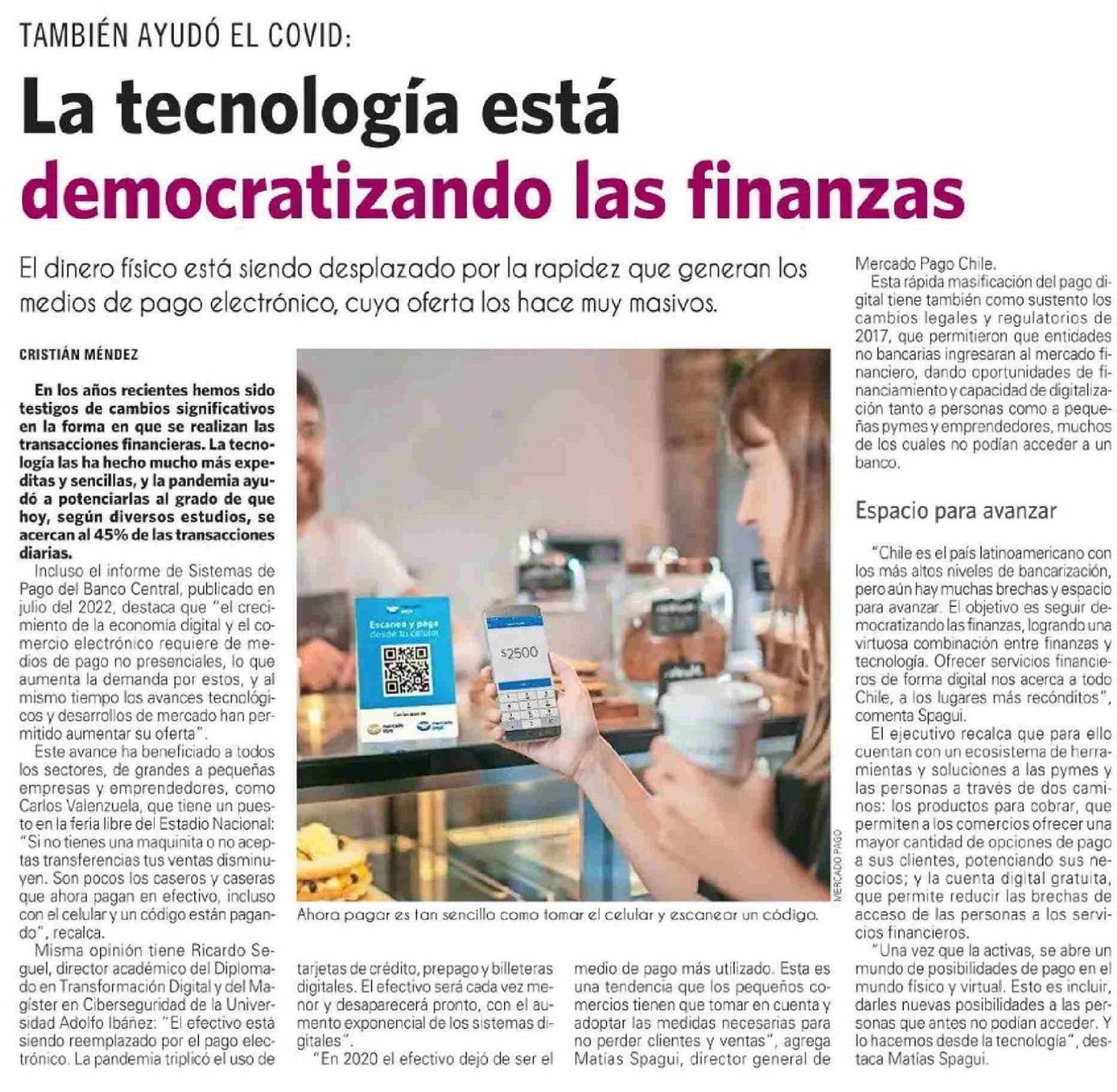 El Mercurio, Cristian Mendez destaca opinión de Ricardo Seguel, Ph.D., Director de DTC Cyber y Director del Magister de Ciberseguridad de la Universidad Adolfo Ibáñez, donde se refirió a la democratización de las finanzas por medio de la tecnología.