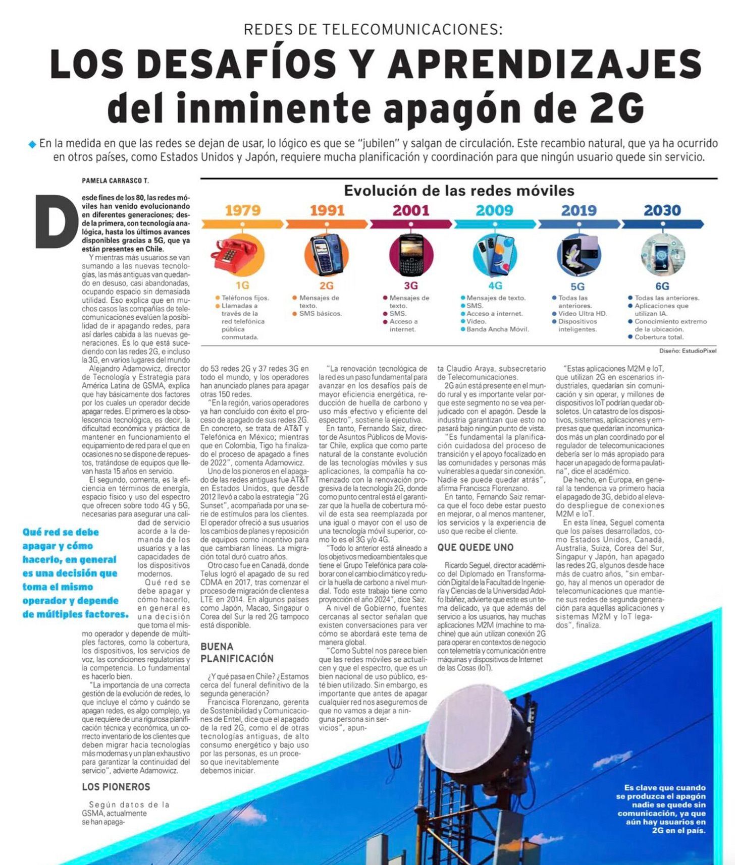 El Mercurio Chile Tecnológico, Pamela Carrasco destaca los comentarios de Ricardo Seguel, Director académico del Diplomado en Transformación Digital de la Facultad de Ingeniería y Ciencias UAI, acerca del inminente apagón de 2G.