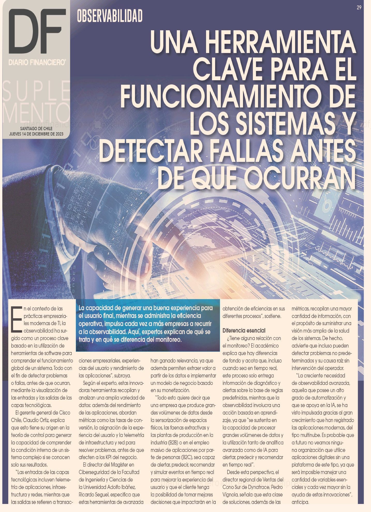 Diario Financiero, destaca los comentarios de Ricardo Seguel, Ph.D., director del Magíster de Ciberseguridad de la Facultad de Ingeniería y Ciencias UAI, acerca de la "Observabilidad". El académico señaló que "una empresa que produce grandes volúmenes de datos desde la sensorización de espacios físicos, las faenas extractivas y las plantas de producción....( ) sea capaz de alertar, predecir, recomendar y simular eventos en tiempo real para mejorar la experiencia del usuario...".